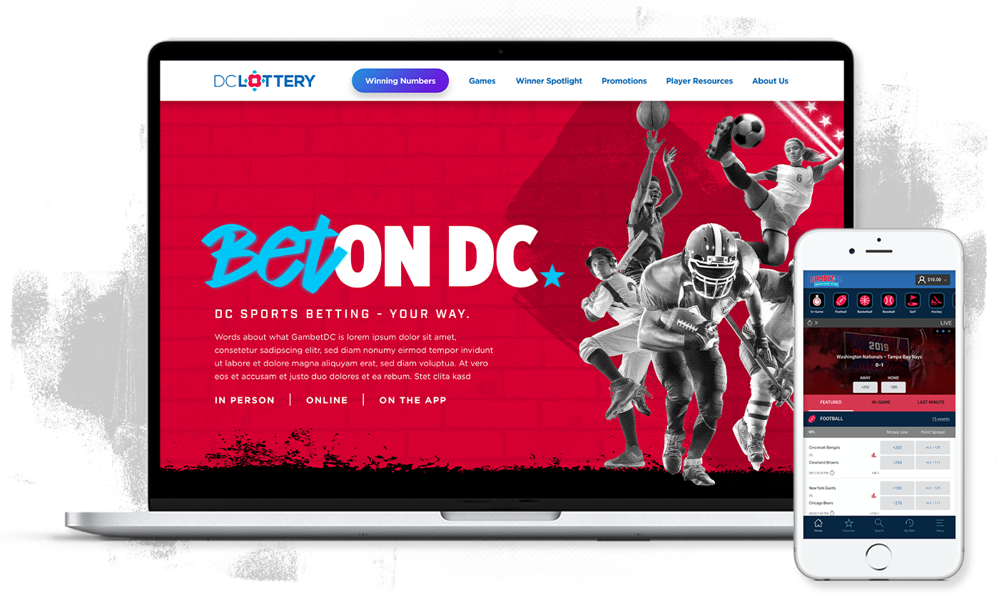 GambetDC is DC Lottery’s sports betting app, and in the summer of 2021 they decided to launch a series of kiosks in bars around DC to pull in new players. They wanted to create some buzz around this retail launch, and take the opportunity to breathe some life into their visual brand. Since the DC Lottery’s audience is hyper-local, we created a look and feel that reflects the city and captures the excitement and immediacy of watching (and betting on) sports.